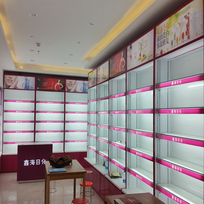 店铺名称: 鑫海日化 店铺类型: 烟酒展柜 是否定制: 是 制作尺寸: (常规)尺寸可订做,可按要求设计出效果图 制作材质: 中纤板+烤漆+LED灯+钢化玻璃+软膜灯箱+广告画+发光字 安装地点: 四川美博城 服务内容: 设计+制作+安装 物流方式: 运输
