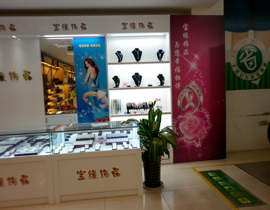 店铺名称: 新繁宝缘饰 店铺类型: 饰品展柜 是否定制: 是 制作尺寸: (常规)尺寸可订做,可按要求设计出效果图 制作材质: 中纤板+烤漆+LED灯+超白玻璃+五金配件+广告画 安装地点: 四川成都 服务内容: 设计+制作+安装 物流方式: 运输