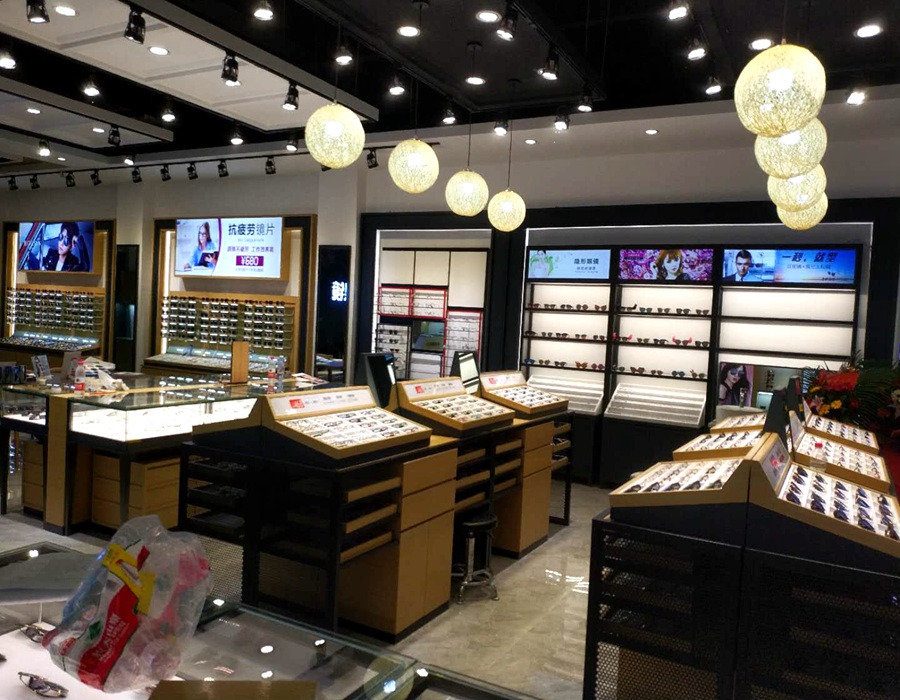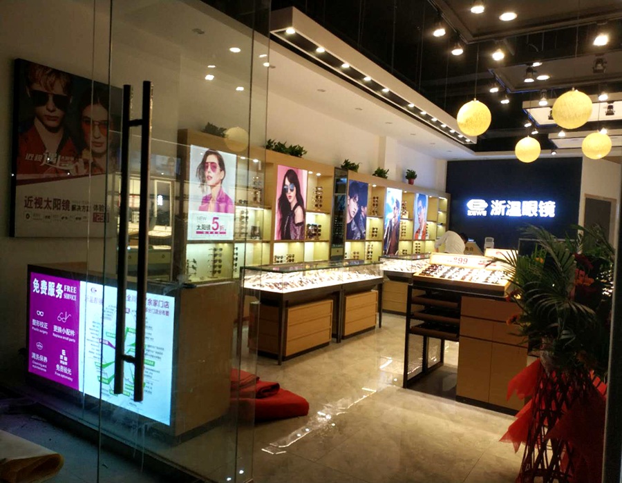 店铺名称: 浙温眼镜 店铺类型: 眼镜展柜 是否定制: 是 制作尺寸: (常规)尺寸可订做,可按要求设计出效果图 制作材质: 木皮烤漆+LED灯+超白玻璃+黑色矩管+软膜灯箱+发光字 安装地点: 四川 服务内容: 设计+制作+安装 物流方式: 运输