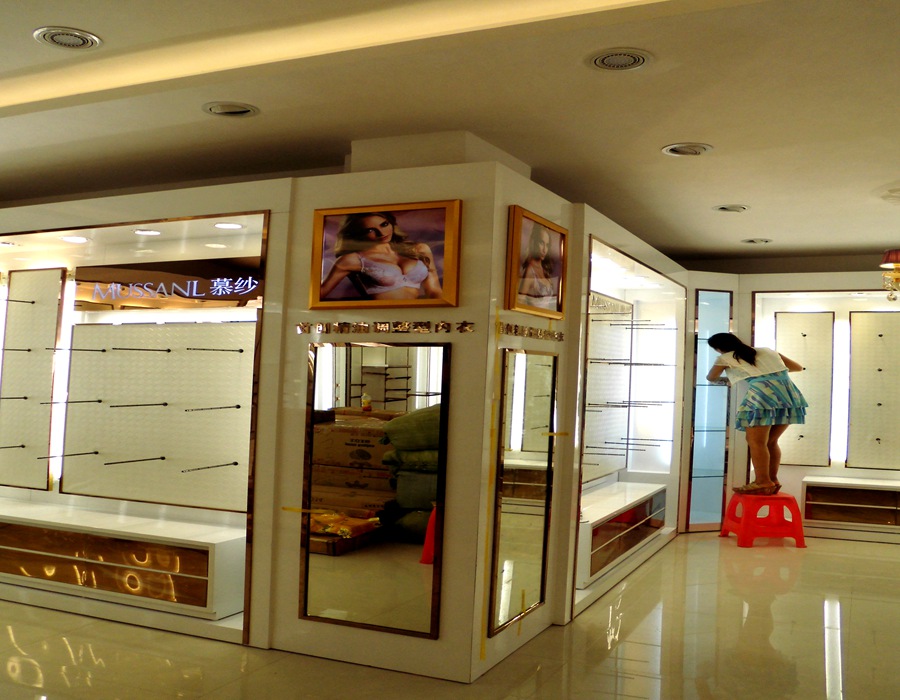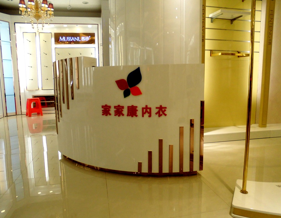 店铺名称: 家家康 店铺类型: 内衣展柜 是否定制: 是 制作尺寸: (常规)尺寸可订做,可按要求设计出效果图 制作材质: 中纤板+烤漆+LED灯+软膜图画+钛合金+发光字+亚克力 安装地点: 四川成都 服务内容: 设计+制作+安装 物流方式: 运输